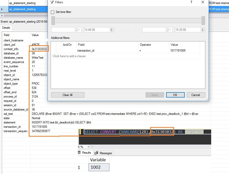 At this stage, we already have everything in place to capture the variables (outputed to context_info) on our XEvents session and correlate with deadlock using the xActID aka TransactionID.